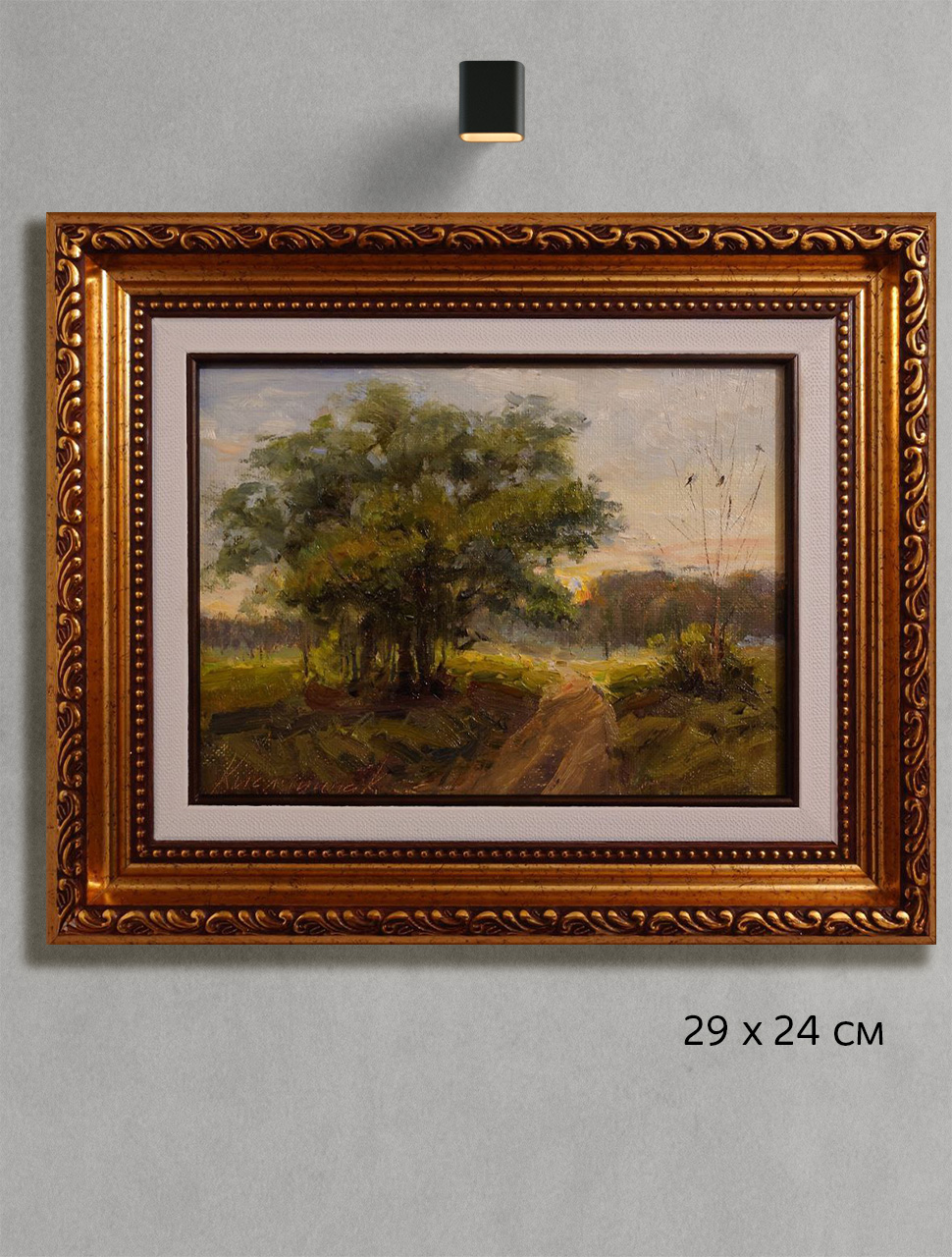 На картине изображён умиротворённый пейзаж на закате. Центральным элементом композиции является извилистая грунтовая тропинка, уходящая вдаль и манящая зрителя вглубь картины. Тропинка окружена густой зеленью травы и кустарников, что создаёт ощущение живой, дышащей природы. Слева возвышаются мощные стволы дубов, их ветви раскинулись вширь, образуя ажурный навес. На ветвях сидят три птицы, их силуэты чётко выделяются на фоне закатного неба. Птицы добавляют композиции нотку спокойствия и гармонии, подчёркивая связь человека с природой. Фон картины наполнен мягкими оттенками заката: небо окрашено в тёплые золотисто-оранжевые тона, плавно переходящие в нежно-голубой цвет. Вдали виднеется лесная полоса, окутанная лёгкой дымкой, что создаёт эффект глубины и перспективы. Лёгкие облака на небе добавляют воздушности и завершённости пейзажу. В целом, картина передаёт атмосферу тихого вечера в лесу, наполненного спокойствием и лёгкой меланхолией. Художник мастерски использует игру света, цвета и композиции, чтобы погрузить зрителя в мир природы, вызвать у него чувство умиротворения и созерцательности.