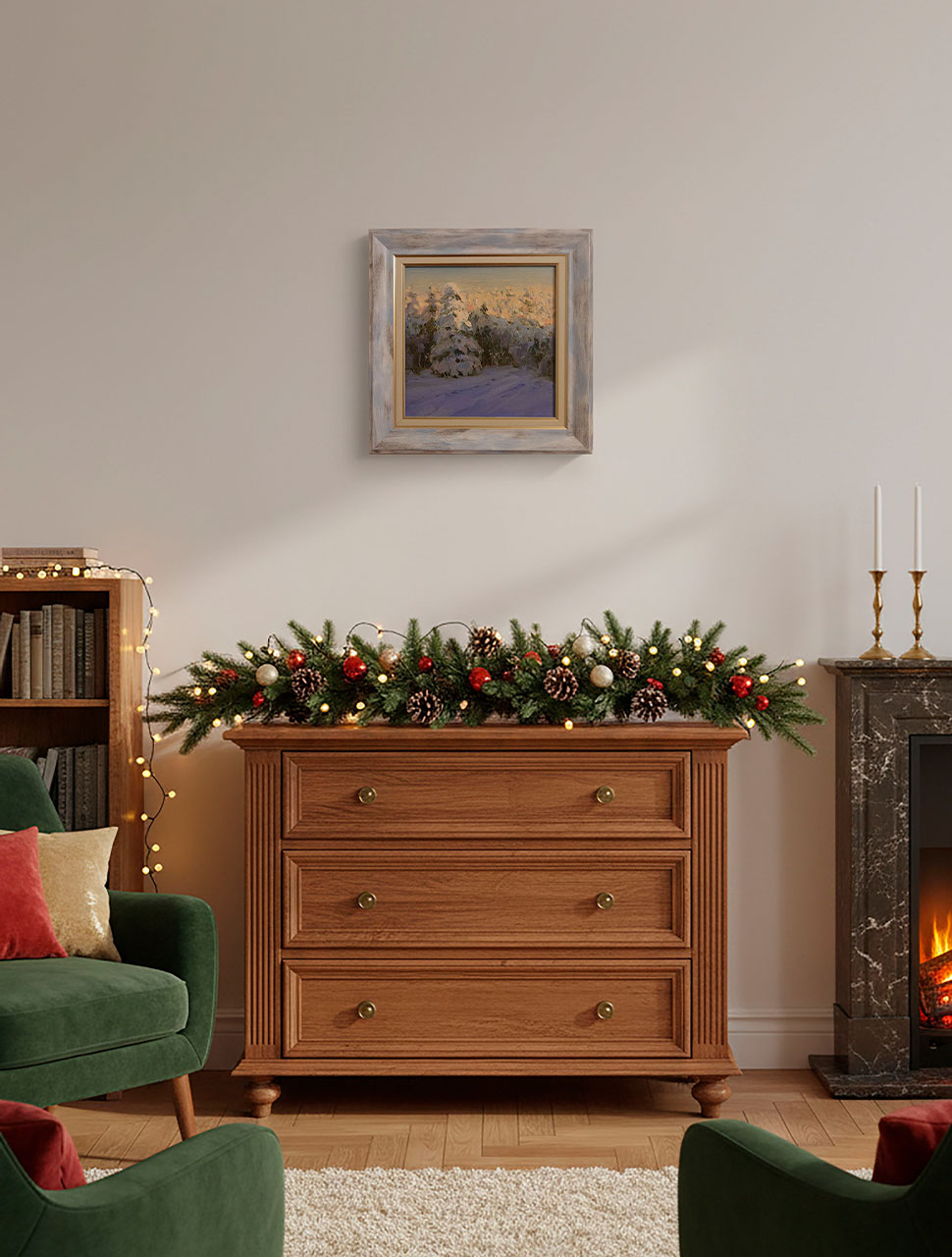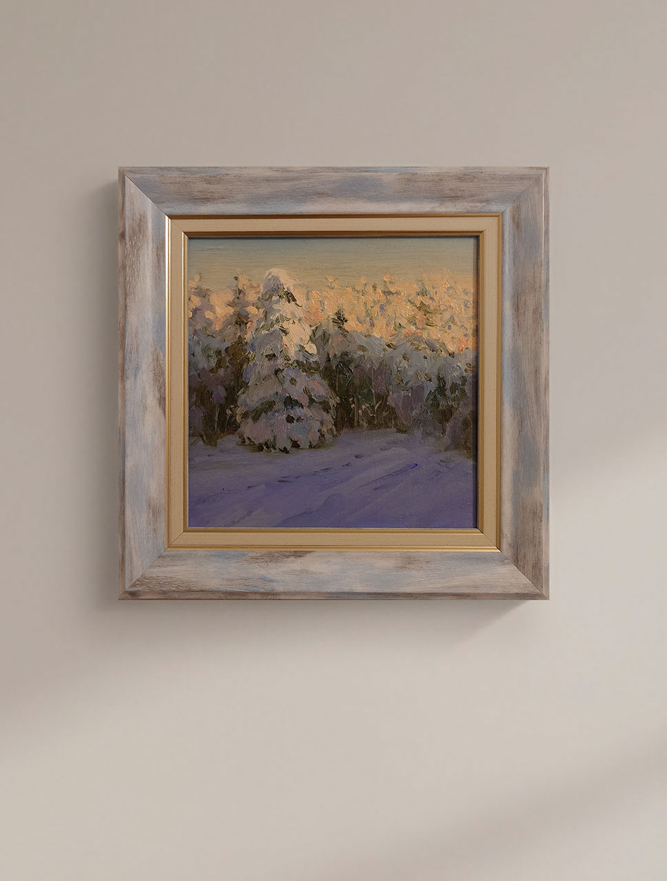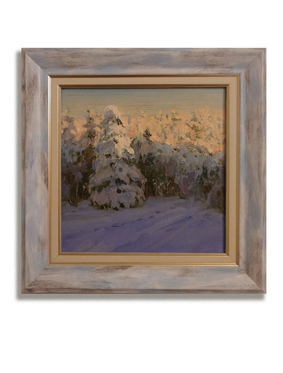 Эта картина передаёт тихое волшебство зимнего вечера, когда лес уже укутан в сумерки, а верхушки елей ещё ловят последние тёплые лучи солнца. Мягкий, чуть дымчатый свет на горизонте плавно перетекает в холодные фиолетово-синие тени на снегу, создавая ощущение хрупкого равновесия между днём и ночью. Плотные пастозные мазки масляной краски придают сугробам и ветвям объём, будто снег можно потрогать руками.