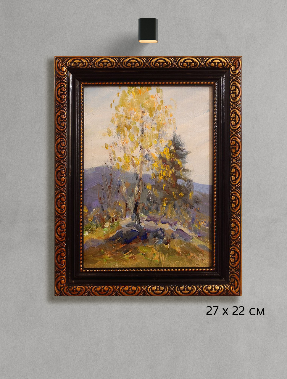 Перед вами живописная картина, выполненная маслом на холсте на картоне. Работа погружает зрителя в атмосферу спокойного осеннего дня, наполненного мягким светом и умиротворением.