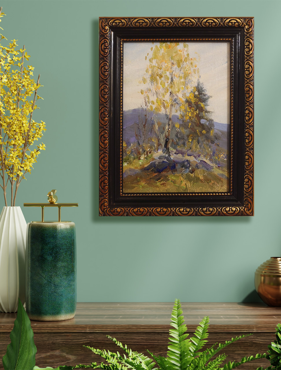 В центре композиции величественно возвышается стройная берёза, окутанная золотисто-жёлтой листвой. Её ветви раскинулись вширь, словно приветствуя прохладный осенний ветер. Тёплые оттенки жёлтого и охры создают ощущение солнечного света, который мягко ложится на листья, подчёркивая хрупкость и красоту уходящего лета.
