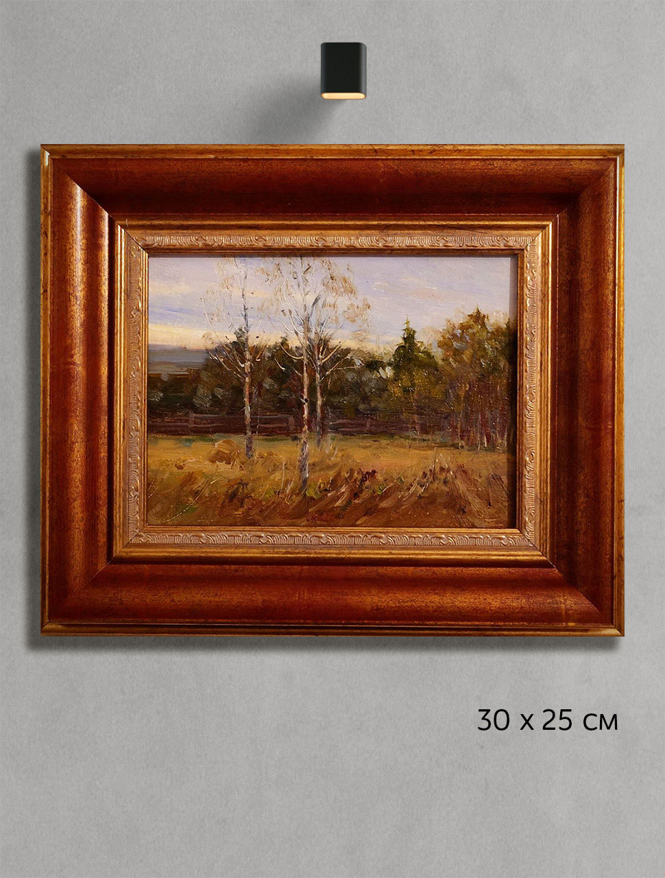 Перед вами живописная картина, выполненная в технике масляной живописи и обрамлённая изысканной деревянной рамой тёплого коричневого оттенка. На полотне запечатлён спокойный сельский пейзаж, наполненный умиротворением и лёгкой меланхолией.