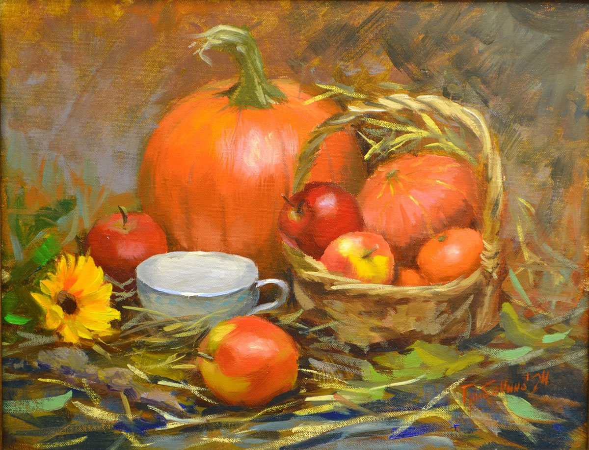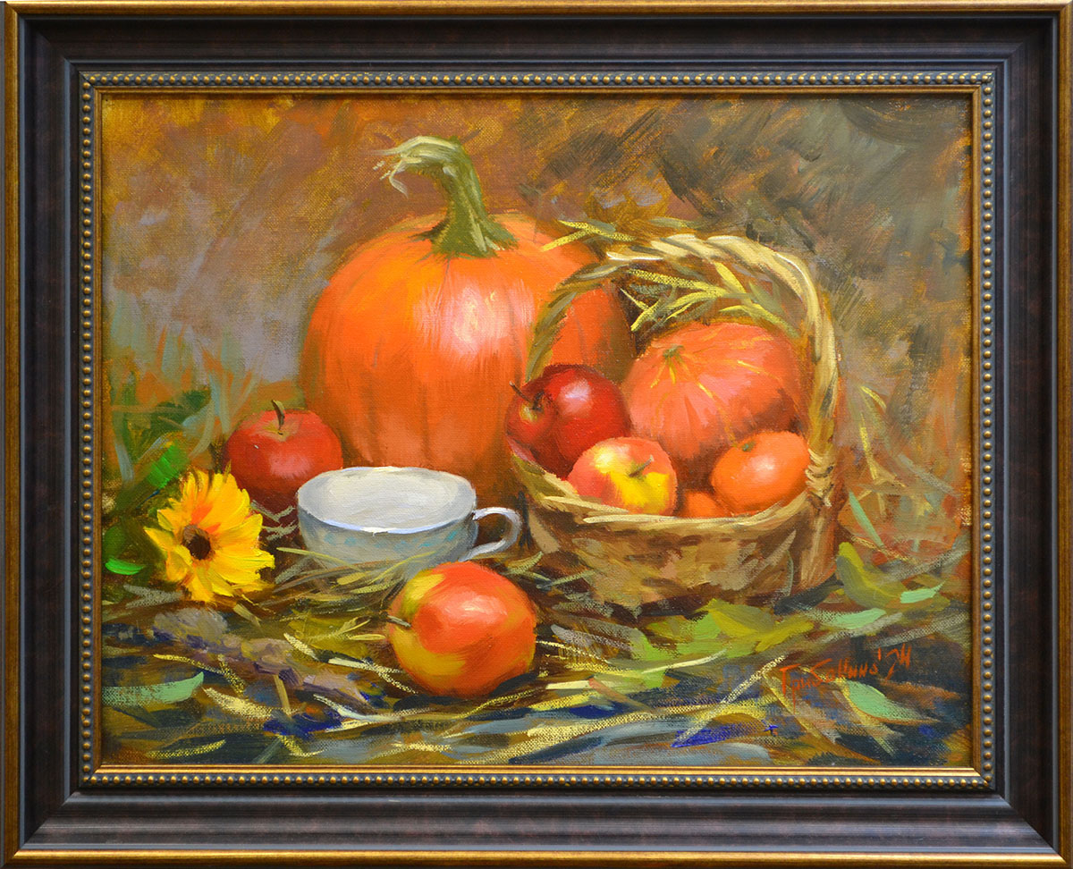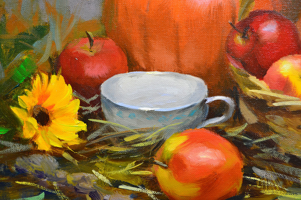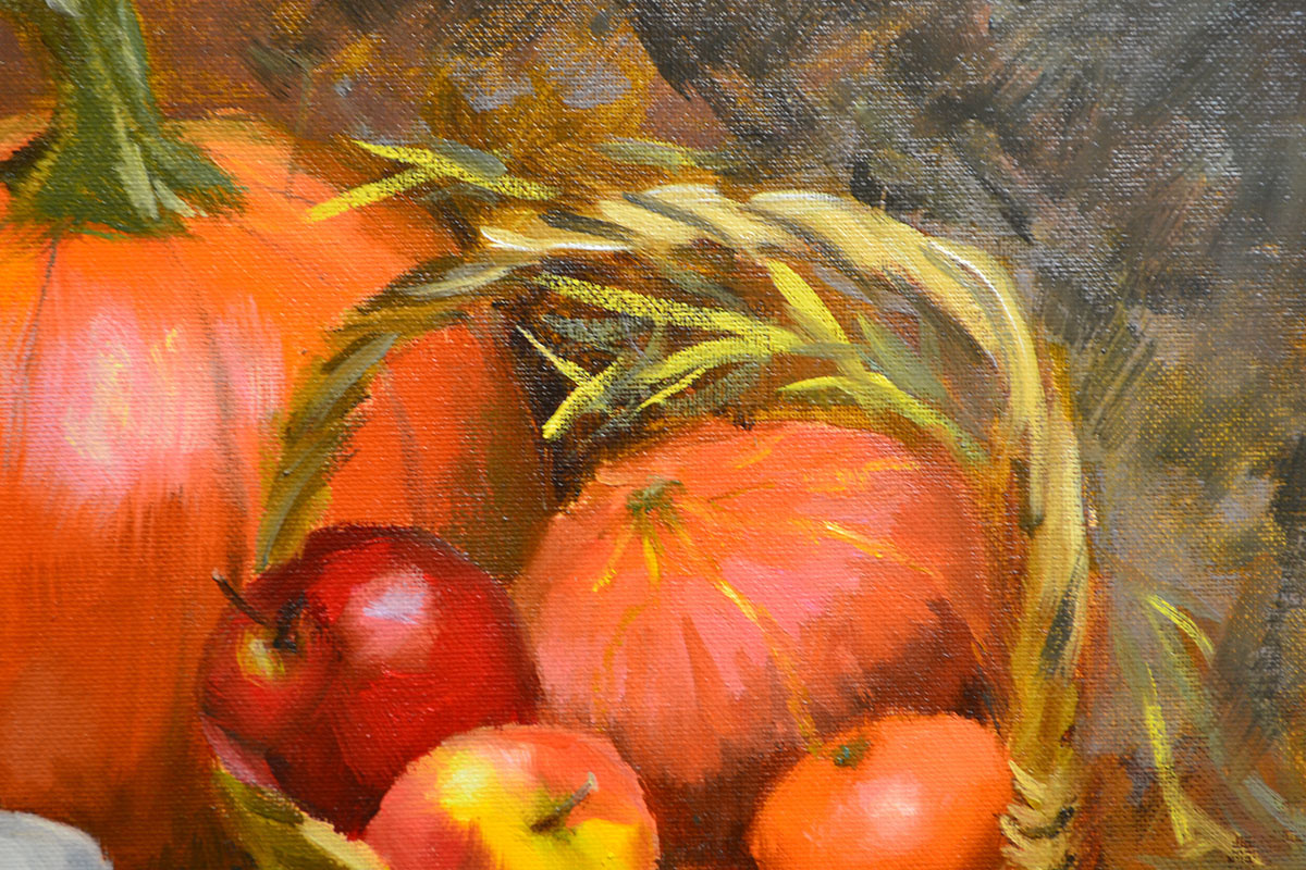 Картина написана в октябре в канун Хеллоуина. Большая тыква такой сорт и имеет — Хеллоуин. Мне было интересно написать тыкву и я расширила натюрморт до целого урожая. Мне нравится теплые тона этой картины. Когда смотрю на нее, всегда чувствую ту осеннюю погоду и вкус спелых яблок.