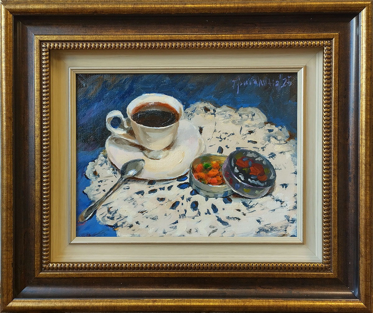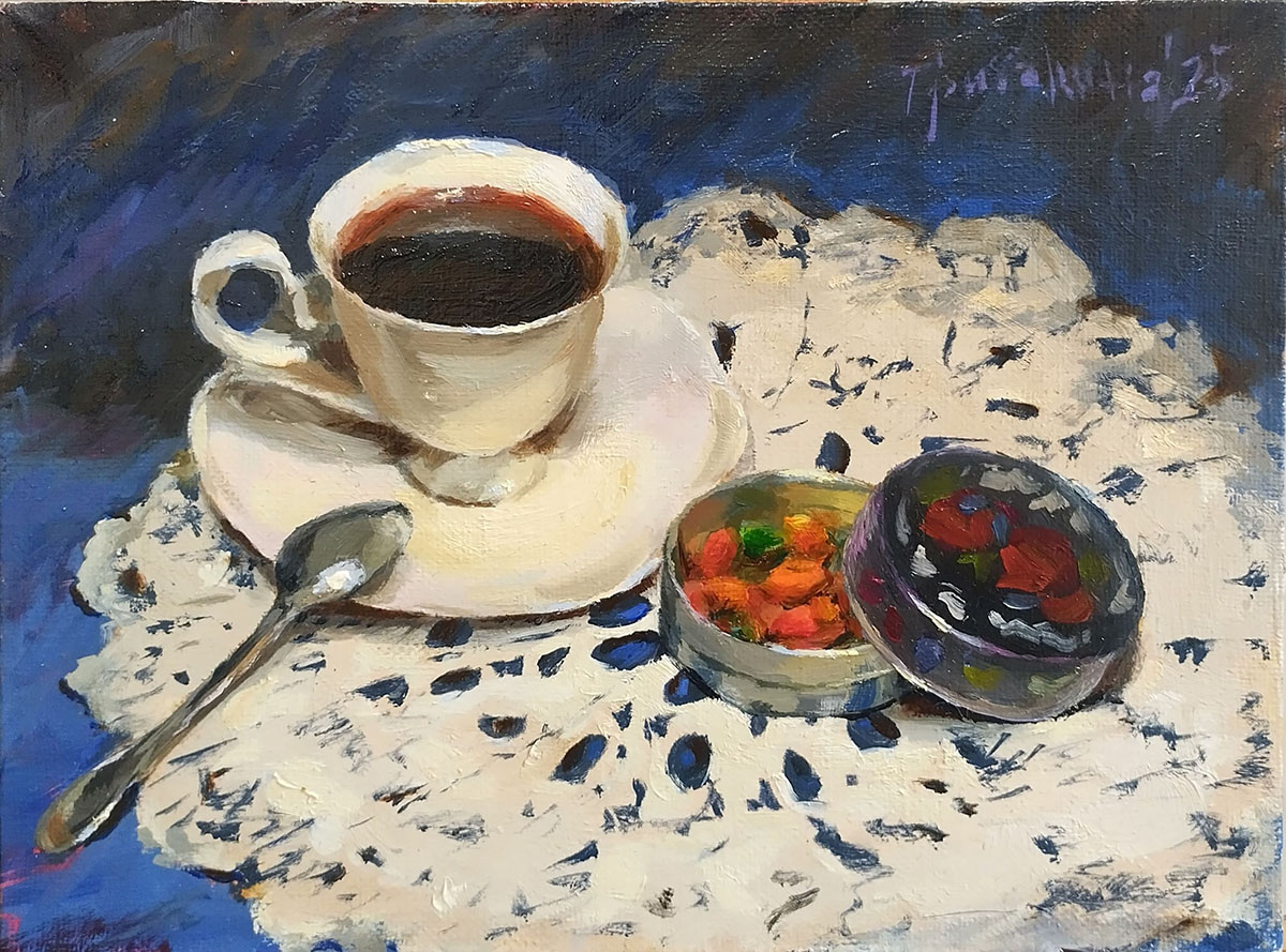 Сюжет был мной задуман еще в 2023 году, я сделала эскиз, но затем отвлеклась на другую работу и забыла про сюжет. Недавно, уже в 2025 году, я перебирала старые эскизы и увидела мою чашечку. Быстро собрала натюрморт и написала небольшую картину.