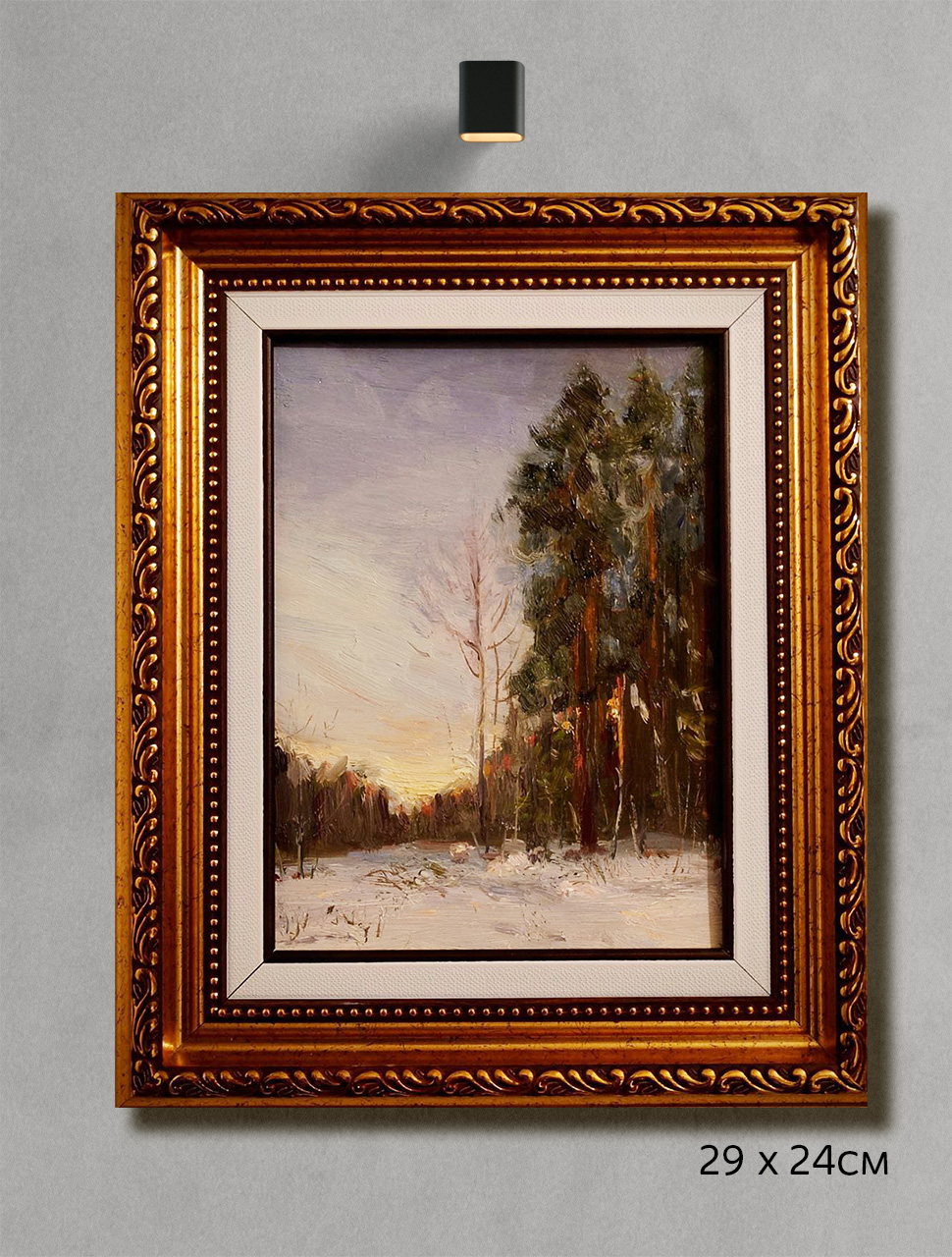 На картине изображён зимний пейзаж с высокими деревьями, залитыми мягким светом. Цветовая палитра насыщена золотистыми, зелёными и коричневыми оттенками, что создаёт ощущение тепла и уюта. Художник уделяет внимание деталям, игре света. Спокойная атмосфера передают гармонию природы. Картина выполнена в реалистическом стиле, что позволяет зрителю почувствовать себя частью изображённого пейзажа. Эта работа отражает любовь художника к природе и его умение передавать её красоту через искусство. Картина станет прекрасным украшением интерьера, добавляя в него нотку спокойствия и эстетики. Подпись художника присутствует как спереди, так и сзади, что подтверждает её подлинность.